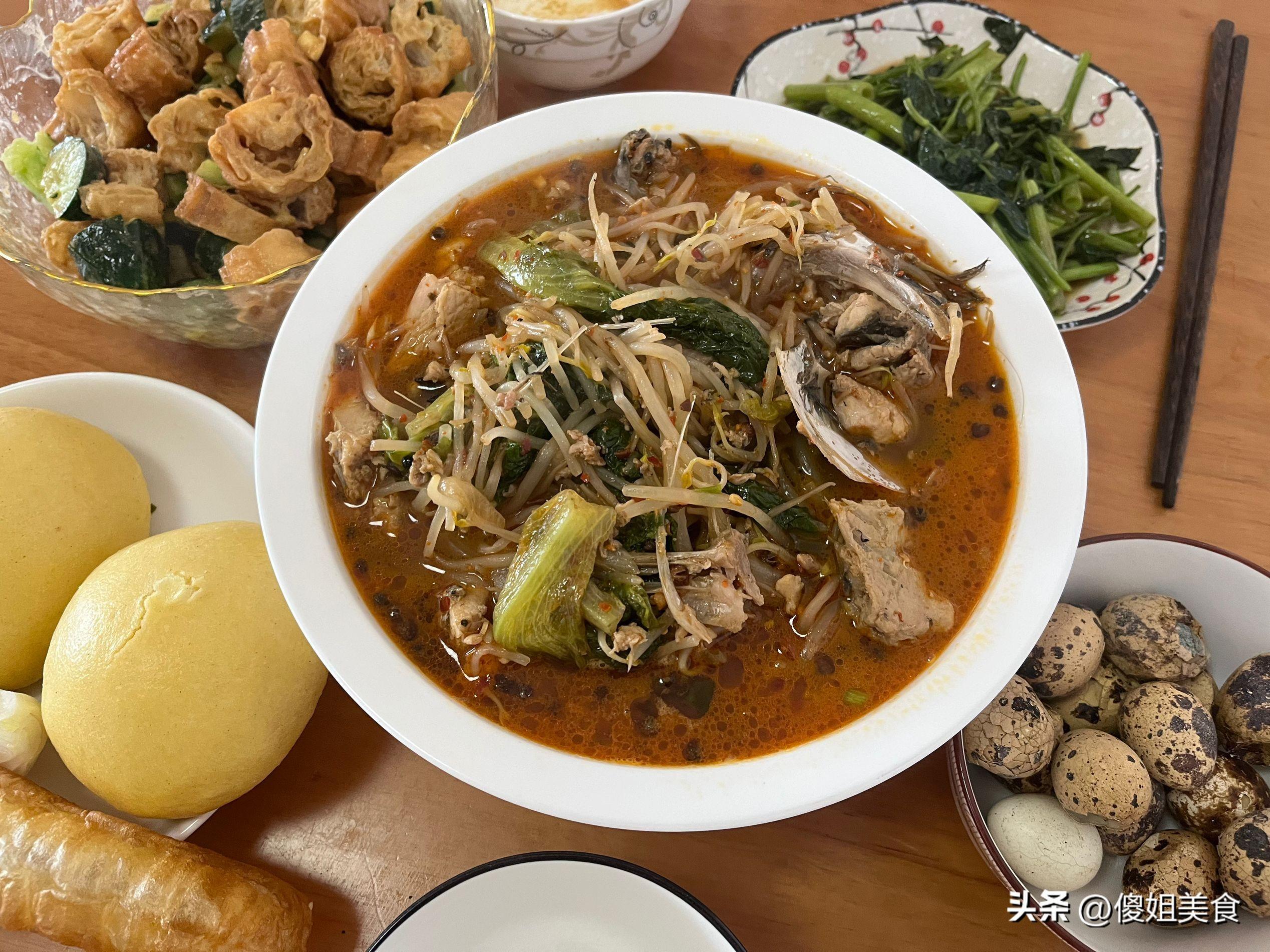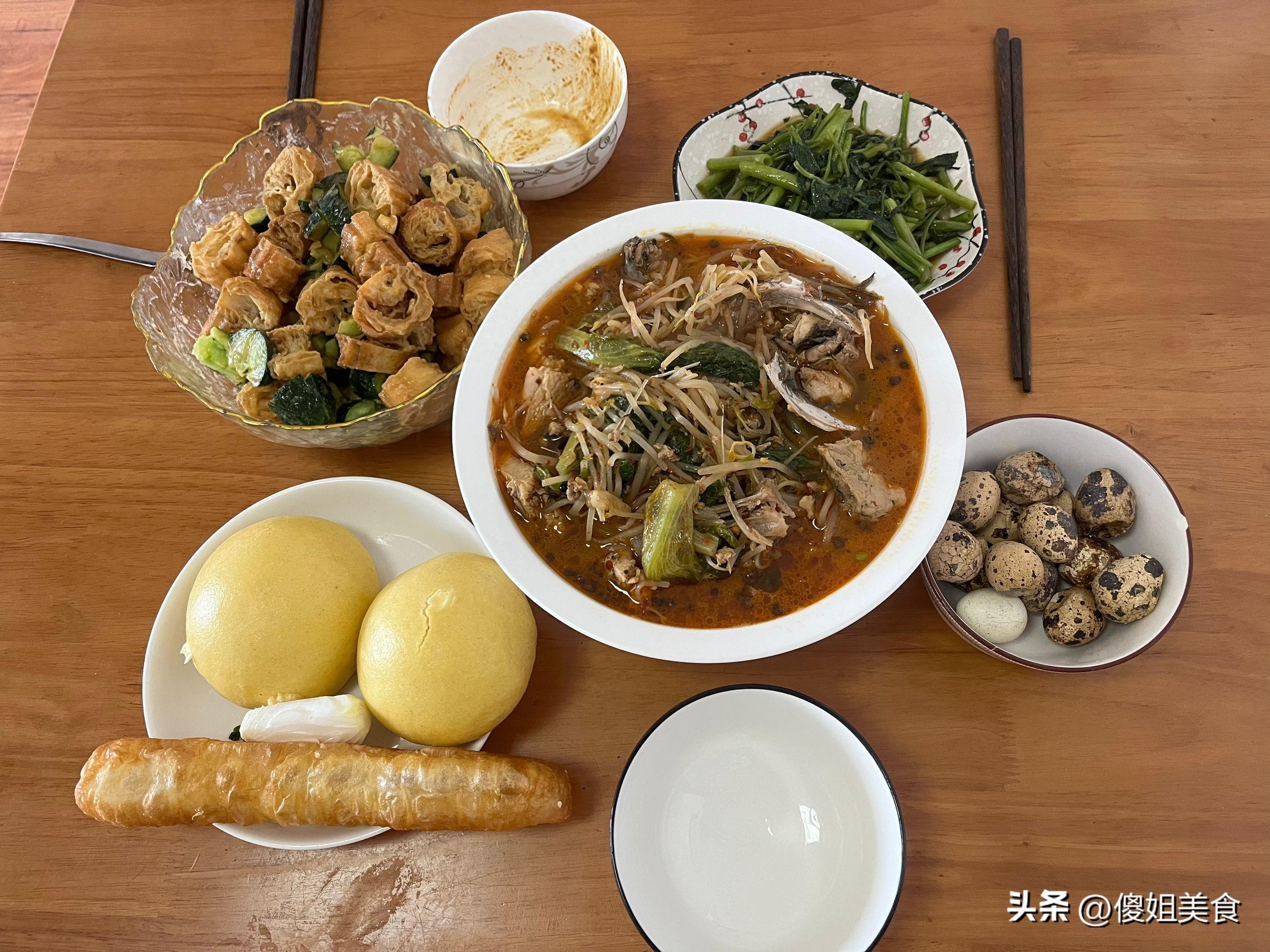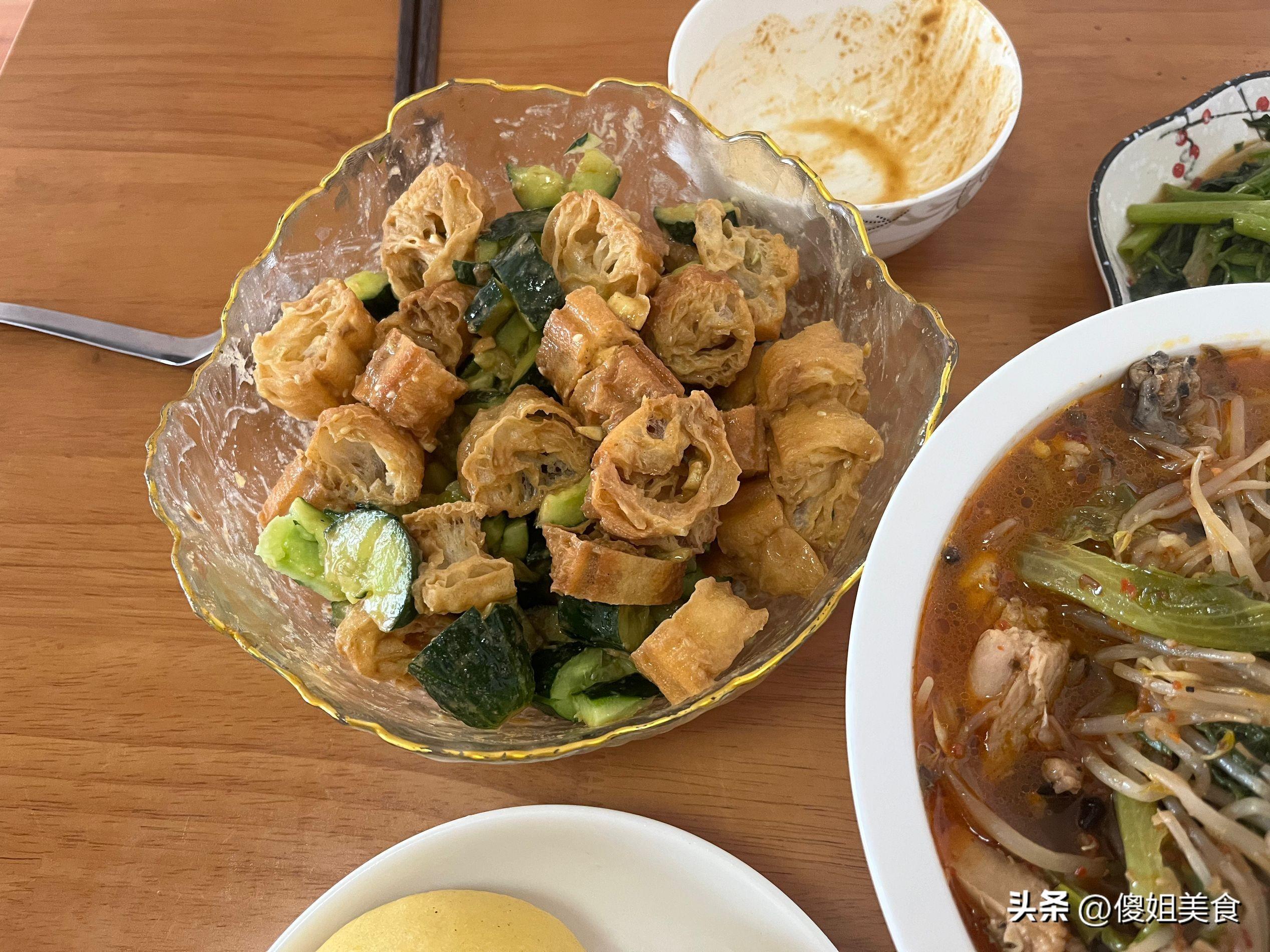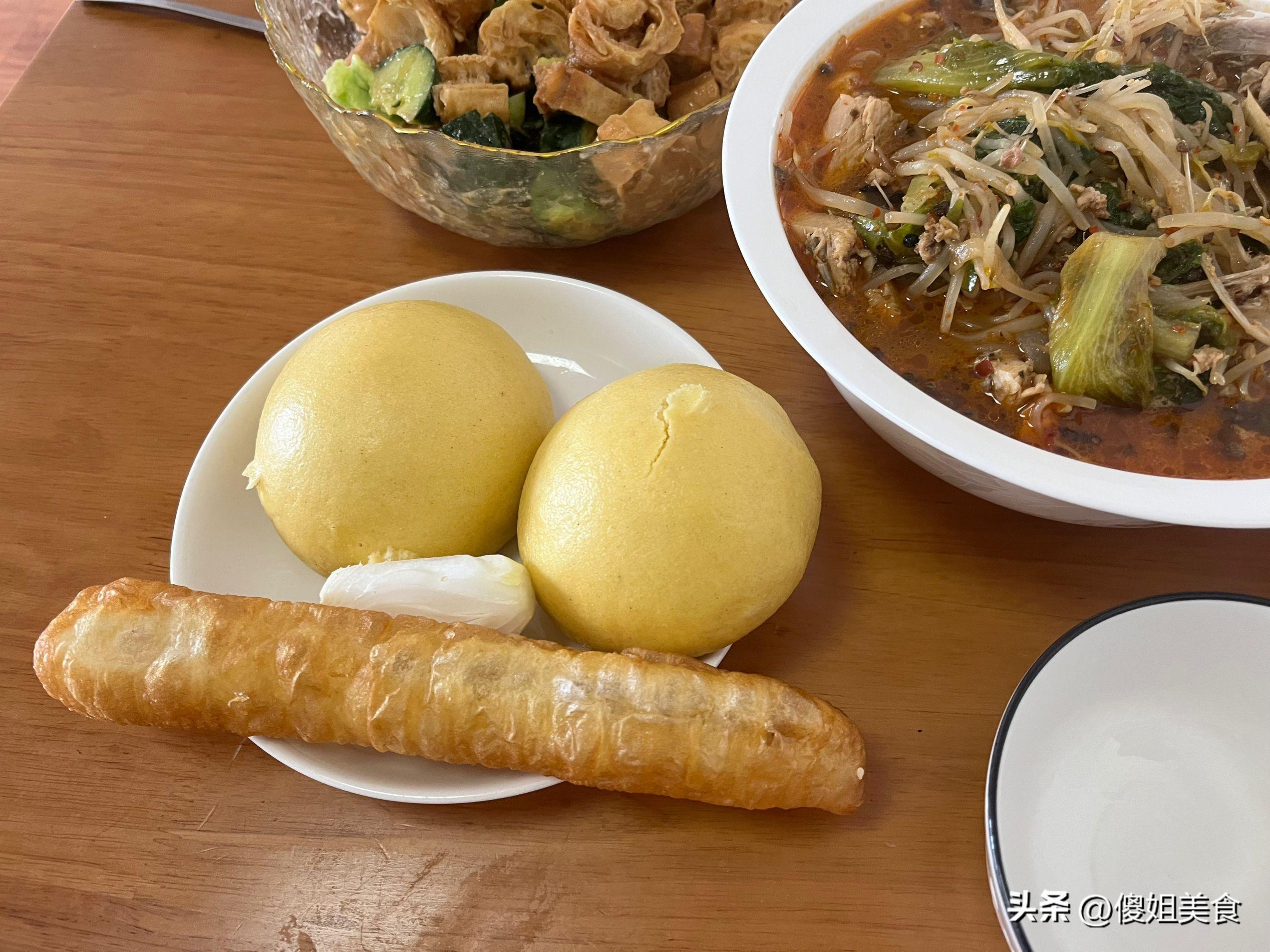 主食給兒子蒸的的白麪加玉米麪的饅頭,玉米麪多一些,發麪的還好點,喫起來不那麼硬,好消化。拌黃瓜剩下了一根油條退,和饅頭一起熱了熱端上桌了。