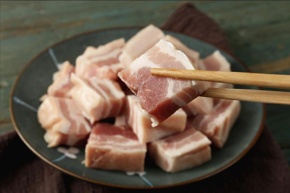 1、我們準備一塊帶皮五花肉,如果覺得帶皮比較難處理的話,買不帶皮的也可以,將其放在水中進行清洗,洗淨之後控幹水分,然後切成小塊。