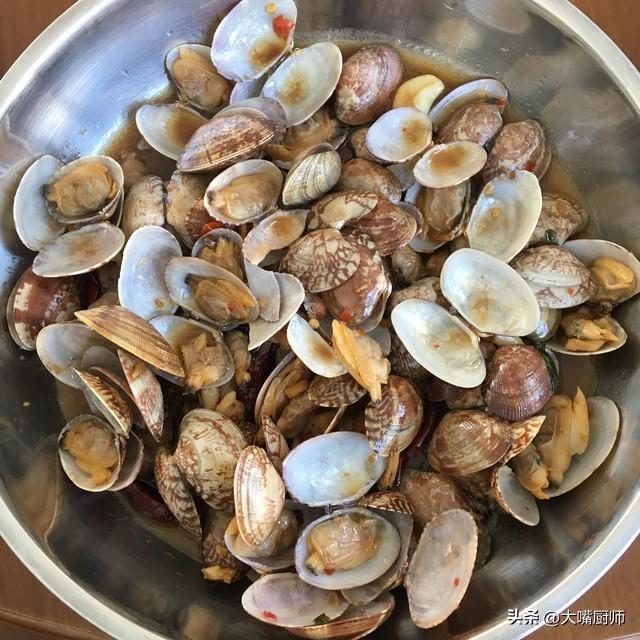 烹煮:倒入花蛤,大火翻炒幾下,加入料酒去腥,隨後倒入適量清水(剛好沒過花蛤即可),加生抽、鹽、糖調味。