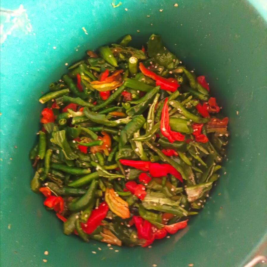 5、大火煮沸以後就可以關火了,待其徹底涼透後,就可以拿來用了。這時候,青辣椒也晾的差不多了,將其倒在一個碗裏,然後往裏面撒上適量的食鹽,充分抓拌均勻,然後倒在一個乾淨的罐子裏。