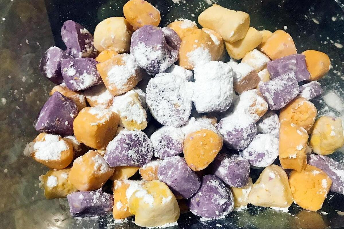 用到:紫薯350g、木薯粉175g、淮山藥100g、木薯粉100g、紅薯180g、木薯粉180g