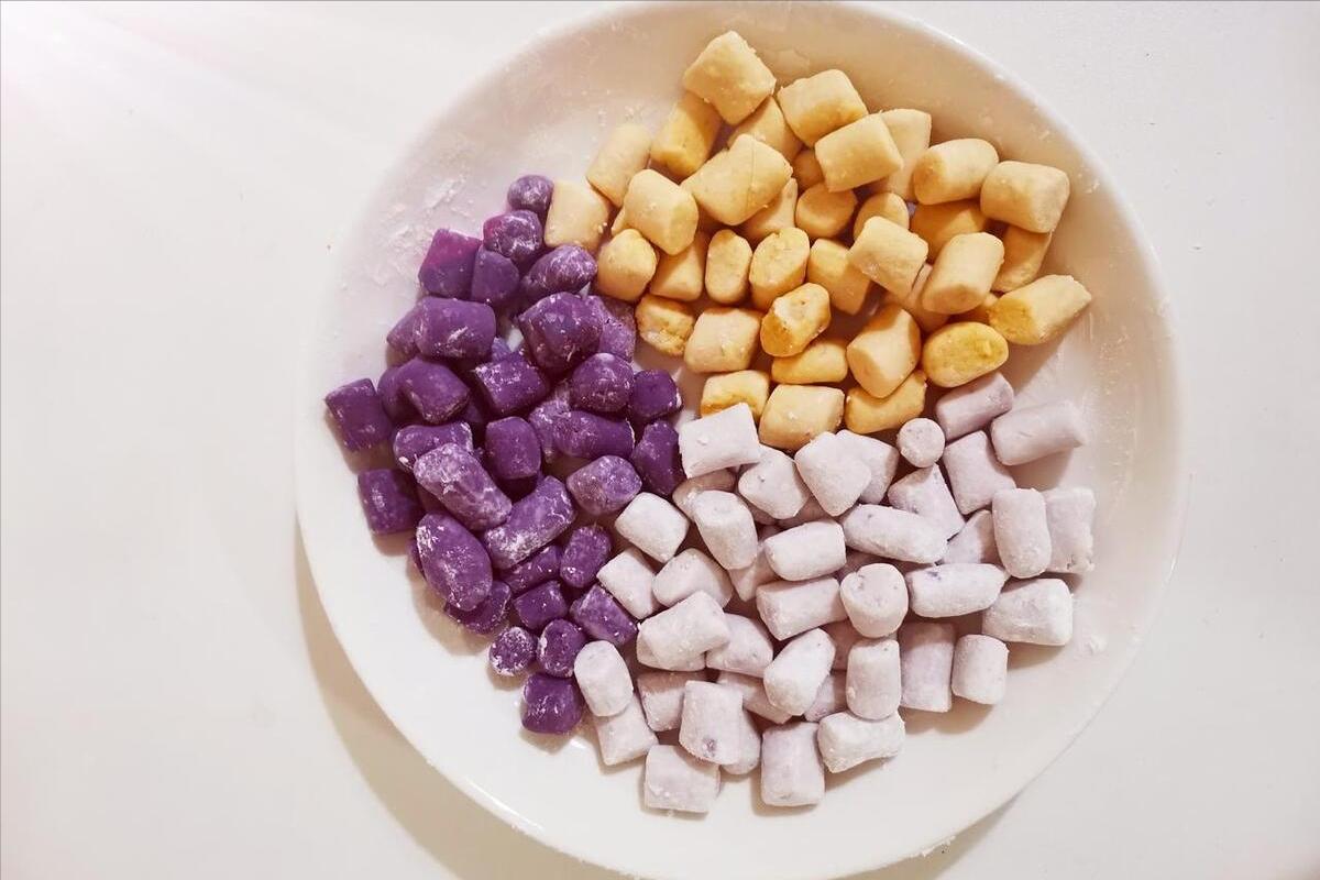 1、做三色芋圓的話,就得用到3種材料,分別是紫薯、淮山藥、紅薯,做成的芋圓分別是紫色的、白色的、黃色的。