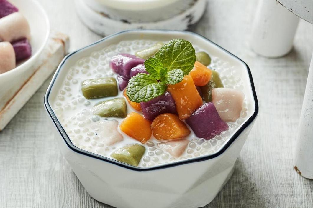 5、這樣芋圓就處理好啦,下面給大家分享一道甜品的做法。準備一個小碗,往裏面放入煮好的西米,芋圓也一起加進去,隨後倒入純牛奶,加上點蜂蜜充分攪拌均勻,最後再來幾塊冰塊,或者把冰塊磨成冰沙倒進去,即可開喫,清爽解暑。