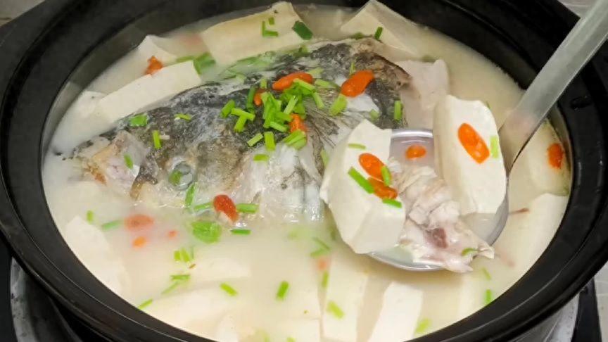 2、鍋內再次燒油,油溫五成熱時放入魚頭煎制,經常搖晃鍋勤翻面讓魚頭均勻受熱,煎至兩面金黃時往裏面倒入適量的開水,放入煎好的雞蛋,蓋上鍋蓋開大火燉煮 10 分鐘。10 分鐘後把豆腐倒入鍋中繼續燉煮 3 分鐘,加入食鹽 3 克,胡椒粉 2 克,淋入一點芝麻香油,撒上蔥花即可。