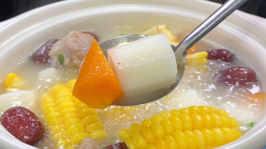 2、鍋中加水,放入排骨、蔥段、薑片,煮開後轉小火慢燉 2 小時,加入山藥塊、玉米段和適量的鹽,再燉 15 分鐘即可。
