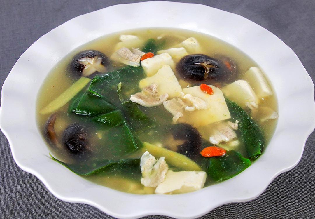 1、香菇去根切十字花刀,海帶結洗淨,嫩豆腐切片,瘦肉切片放入清水中浸泡出血水,枸杞用清水泡上,蔥切蔥花備用。