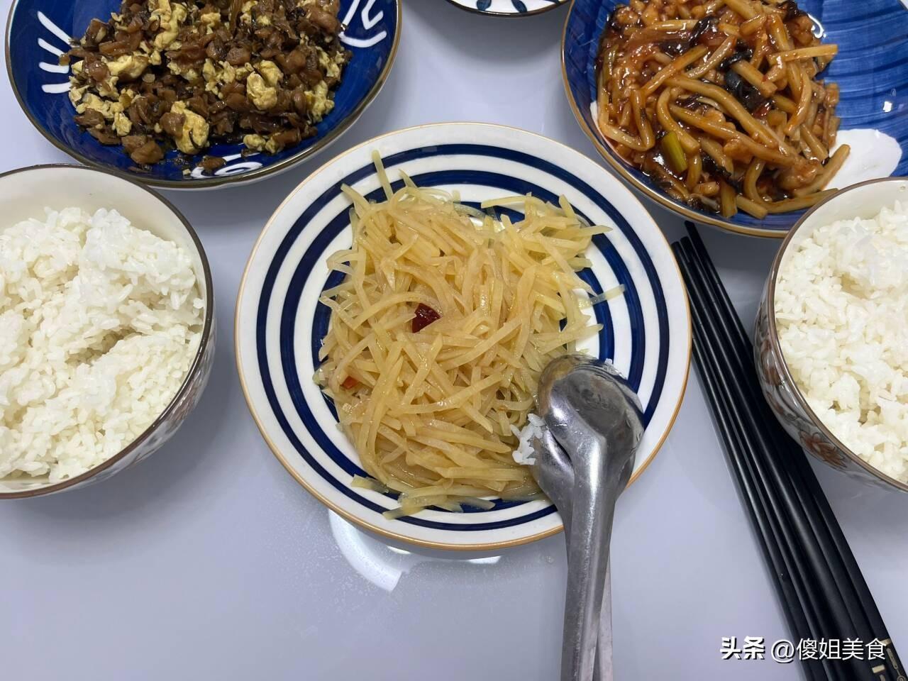 別看酸辣土豆絲是道素菜,但是孩子們都愛喫,我也愛喫,成本還低,兩塊錢就能炒一大盤。把新鮮土豆的外皮清洗乾淨,然後去掉外皮,先切成薄片,再改刀切成細絲,土豆絲用清水浸泡出裏面的澱粉,如果澱粉清洗不乾淨炒出來的土豆絲髮粘不好喫,最後把土豆絲瀝乾水分。熗炒的時候用蔥花、幹辣椒熗鍋,放陳醋、少許味極鮮、白糖和鹽調味,快速翻炒30秒就可以,土豆絲清脆爽口又好喫。