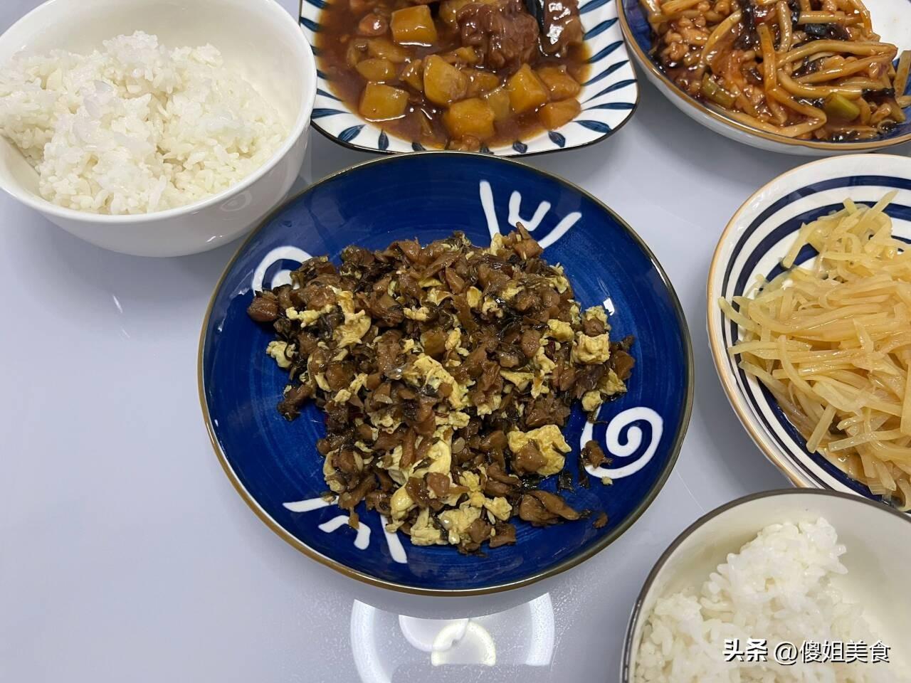 外婆菜很簡單,前段時間買了點乾菜泡了泡,泡好洗乾淨,提前炒2個雞蛋碎,切好木耳,一起和乾菜一炒就可以,舀一勺放入米飯裏拌一拌賊下飯,又好喫。