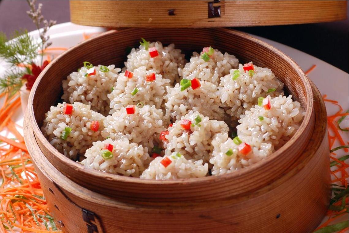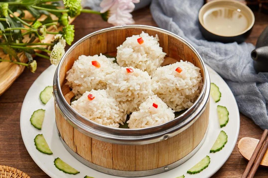 2、糯米要提前備好,用清水浸泡6個小時左右,隨後把肉餡團成一個個的丸子,然後在表面裹上糯米,均勻擺放在盤中,然後開水上鍋蒸,大火上汽後蒸20分鐘,出鍋後點綴上蔥花或者枸杞,即可開喫!