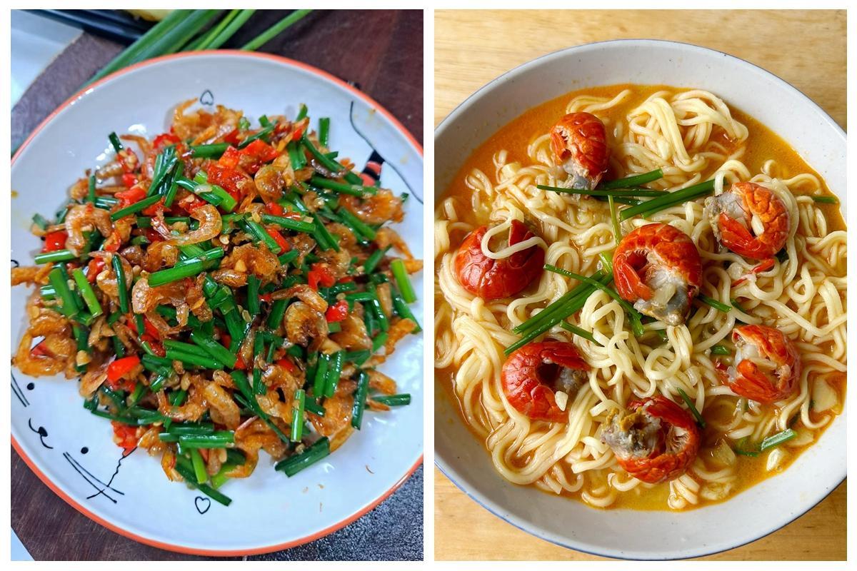 第2天表弟做的是韭菜花炒小蝦。焦黃的小河蝦搭配香嫩的韭菜花,再加上一點辣椒點綴其中,看着就非常的下飯。表弟老婆做的是一碗小龍蝦麪,看着也是挺好喫的,裏面也加了一點韭菜花點綴。