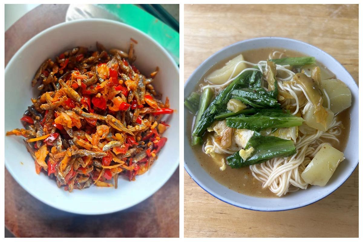 第4天表弟做的是香辣小魚乾,屬於下酒菜系列,聽說他還配了2瓶啤酒。而表弟老婆做的就比較簡單了,麪條搭配雞蛋、土豆和青菜,看着就覺得不好喫。