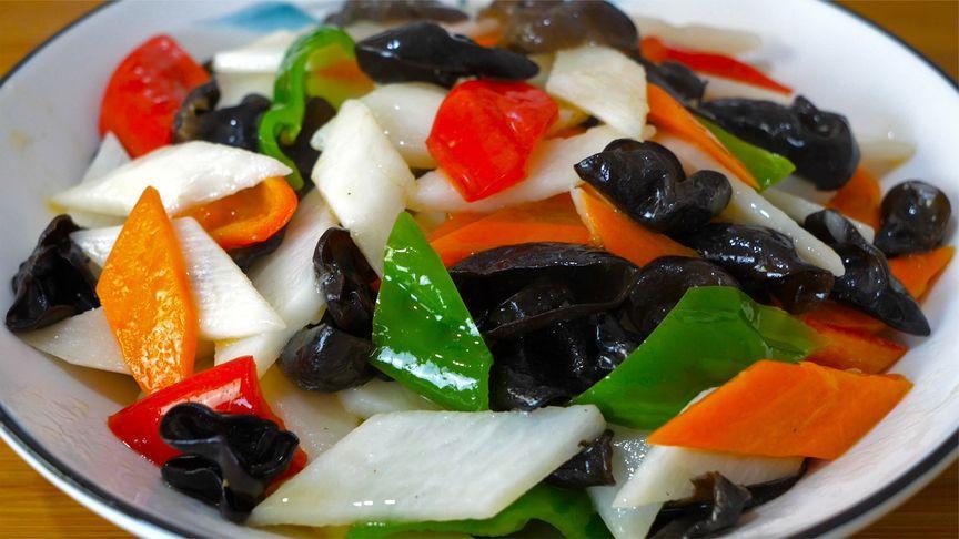 4、再次把鍋燒熱,加入剛剛炸好的蔥油,把木耳、山藥和紅椒控幹水分,油溫五成熱時,把配菜倒入鍋中翻炒均勻,加入食鹽、味精,轉大火快速翻炒化開調料。勾入一點水澱粉,增加調料的吸附力,淋入少許明油提亮色澤,翻勻後即可裝盤上桌。