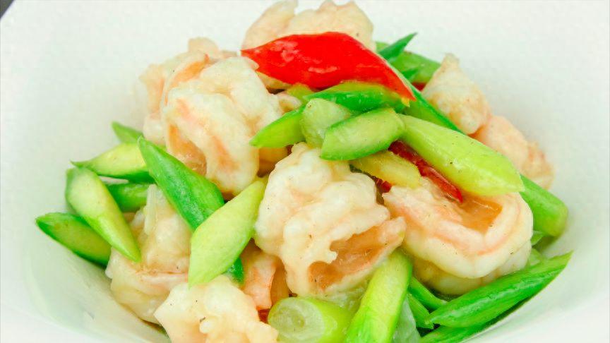 3、鍋內燒油,放入蔥花爆香,倒入蝦仁和蘆筍,大火翻炒至香味融合,加入食鹽、白糖、胡椒粉,繼續翻炒至入味,淋入少許水澱粉增加粘合力,再次翻勻後即可出鍋。