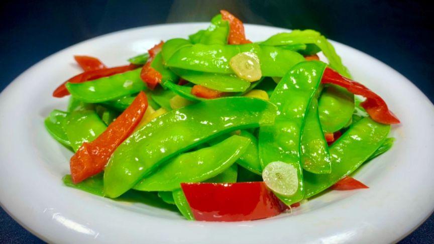 2、鍋內燒油,油燒熱後倒入荷蘭豆和紅椒快速翻炒幾下,加入食鹽、雞粉,從鍋邊淋入一點清水,開大火快速翻炒化開調料,翻勻後即可出鍋。
