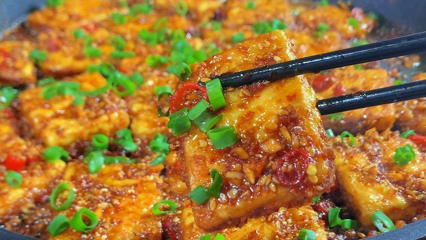 1、將豆腐切成小塊,放入 6 成熱的油鍋中炸至飄起來,變成金黃色後撈出放涼。待豆腐放涼後,將油溫升高,再將豆腐下鍋復炸,炸至金黃酥脆後撈出。