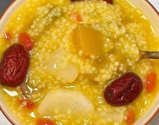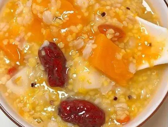2、時間到,打開鍋蓋,一股棗香味撲鼻而來。最後,將煮好的小米山藥紅棗粥盛入碗中,即可享用。