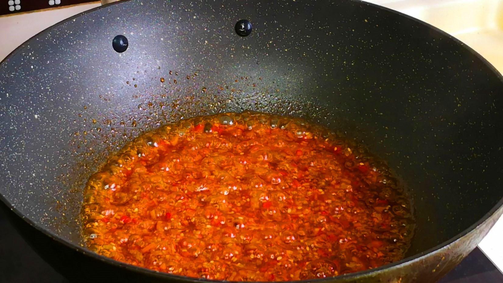 5.趁蒸蓮藕盒的時間,我們再來準備個澆汁:熱鍋加油,下入切細的胡蘿蔔丁和紅椒丁翻炒,炒至胡蘿蔔斷生後再加入一勺白芝麻、1勺生抽、半勺白糖、1勺蠔油和小半碗水澱粉,邊燒邊用鏟子不停地攪拌,熬至湯汁變得紅亮且粘稠以後即可關火。