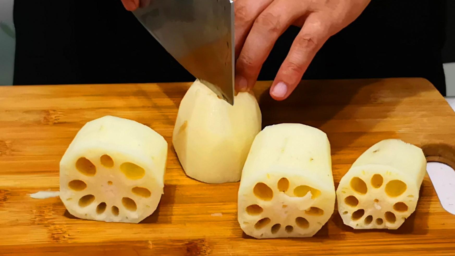 1.先取1~2根蓮藕清洗乾淨,然後削去外皮後再衝洗一下,接着用刀將其切成兩片相連的邊刀片,就像我們平時做茄盒時切有茄子片一樣。