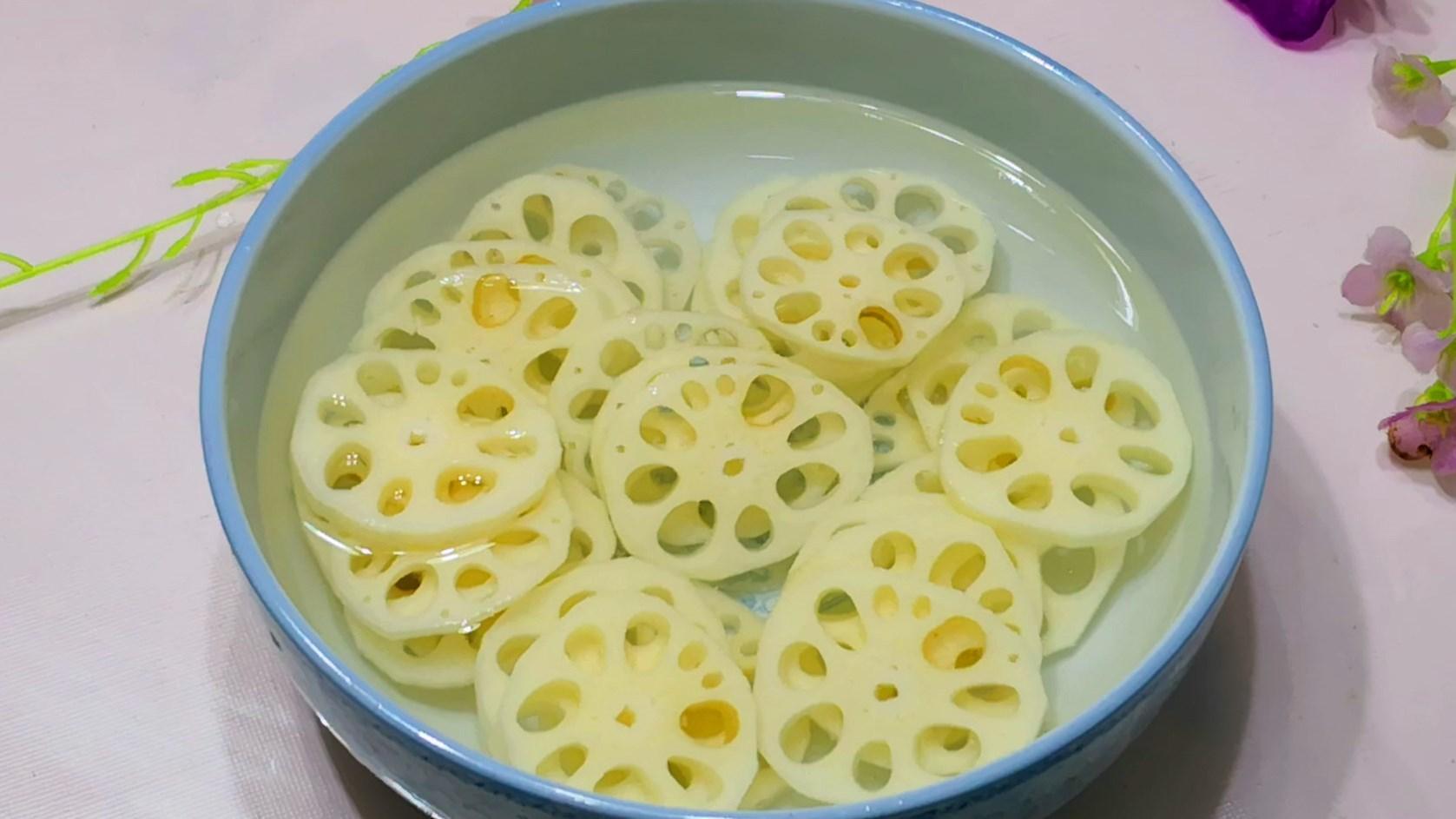 然後取一碗清水,加入幾滴白醋攪拌均勻,再將切好的蓮藕片放入浸泡備用,這樣可以防止藕片氧化變色。