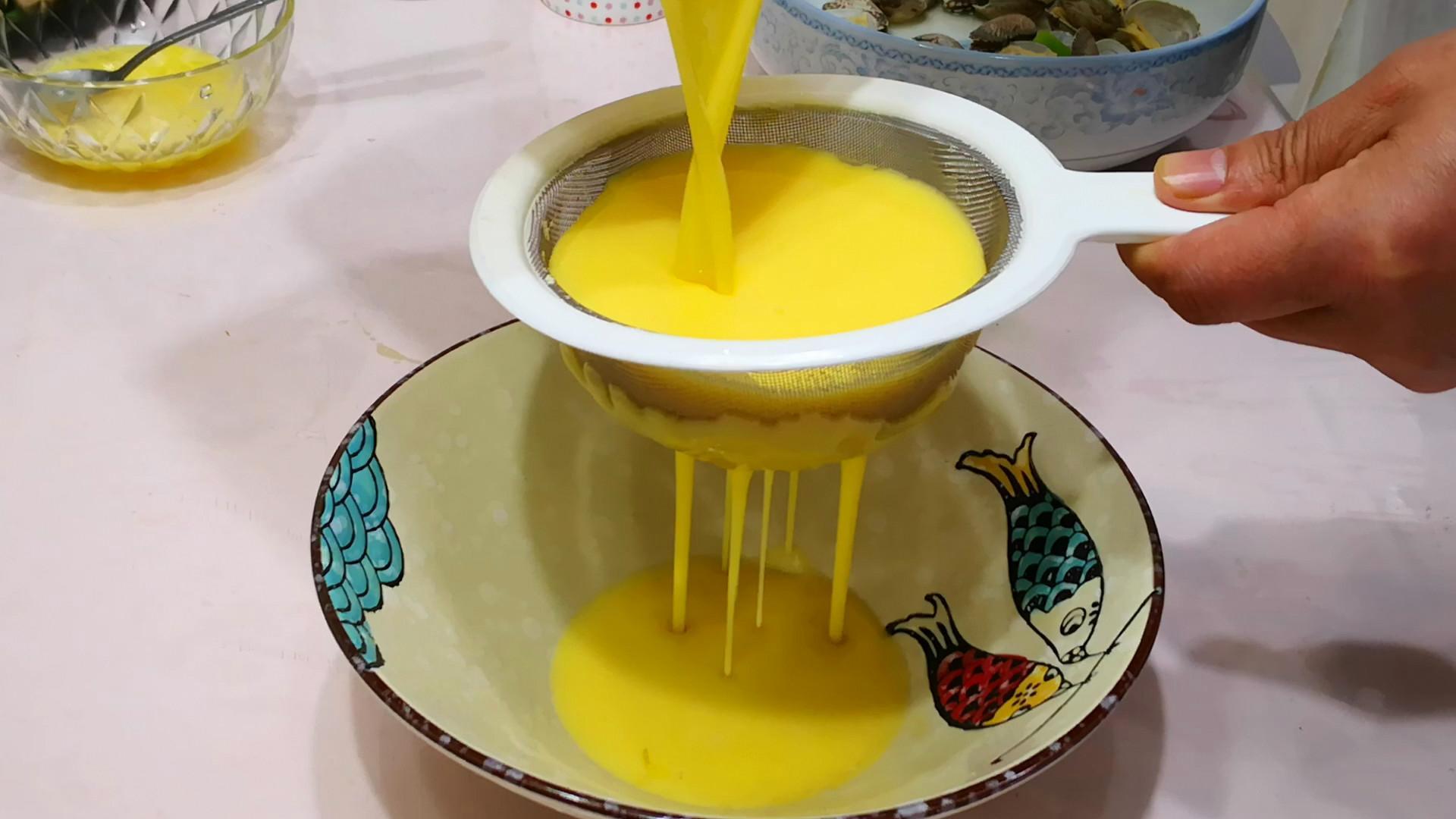 2.接着取一個細過濾網,將打散的蛋液過濾兩遍,過濾掉沒有打散的蛋液和殘渣。過濾好的蛋液倒入到一隻敞口碗中。