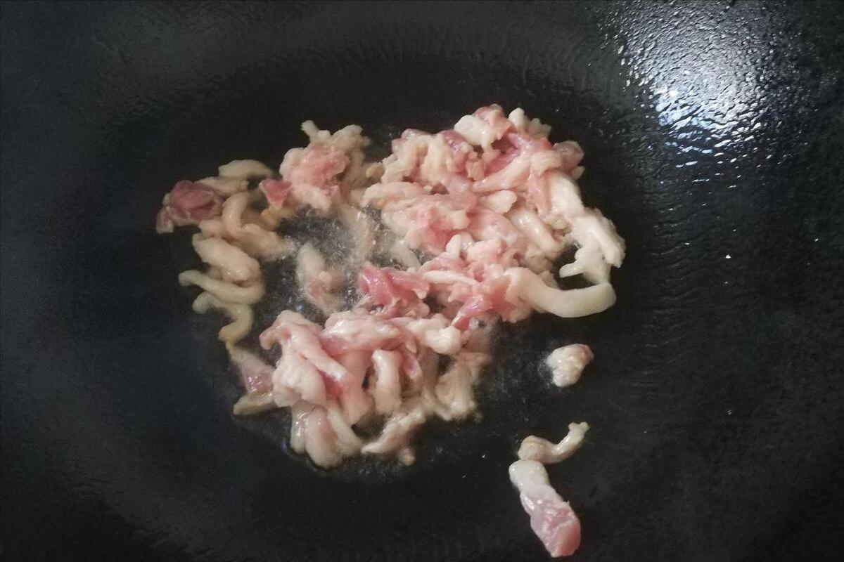 4、把鍋子準備好,將其燒熱以後,往裏面倒入適量的食用油,熱鍋涼油下入醃製好的肉絲開始快速滑炒,炒到變色後迅速盛出來。把肉絲熱鍋涼油滑炒一下,後續再來炒的話就不會出現粘鍋的情況了,這是第2個要點。
