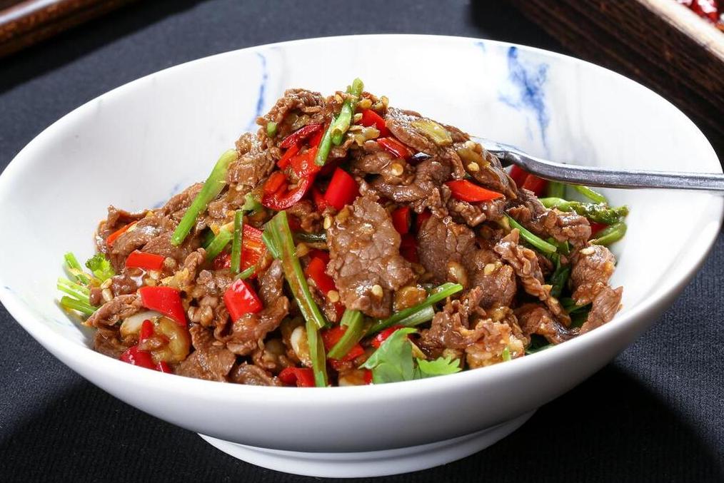 牛肉切絲,加上生抽、料酒、白胡椒粉、澱粉醃製15分鐘,蔥薑蒜等切好。鍋內倒油燒熱後,下入牛肉翻炒至變色盛出來,接着把蔥薑蒜倒進去煸香,隨後重新下入牛肉,加上生抽、蠔油、鹽、雞精調味後,再把小米椒和香菜倒進去,簡單炒兩下,出鍋。