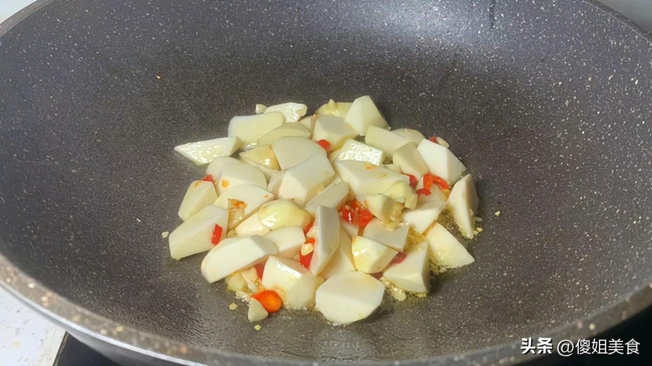 加入芋艿: 把切好的芋艿塊撈出瀝乾水分,倒入鍋中翻炒均勻,使每塊芋艿都裹上剁椒的香味。調味燉煮: 加入一湯匙醬油,半湯匙白糖,翻炒均勻後,倒入適量清水,水量剛好沒過芋艿即可。大火燒開後轉小火燜煮10-15分鐘,直到芋艿變得軟糯入味。
