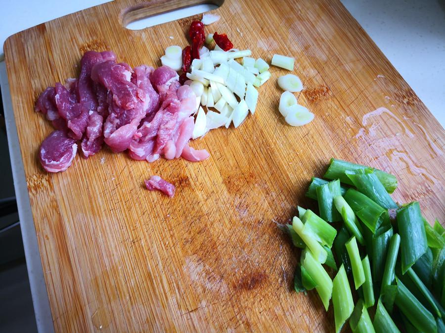 2.再準備適量的五花肉切成薄片,不管炒什麼菜放五花肉炒會更香,當然沒有五花肉,也可以用瘦肉。