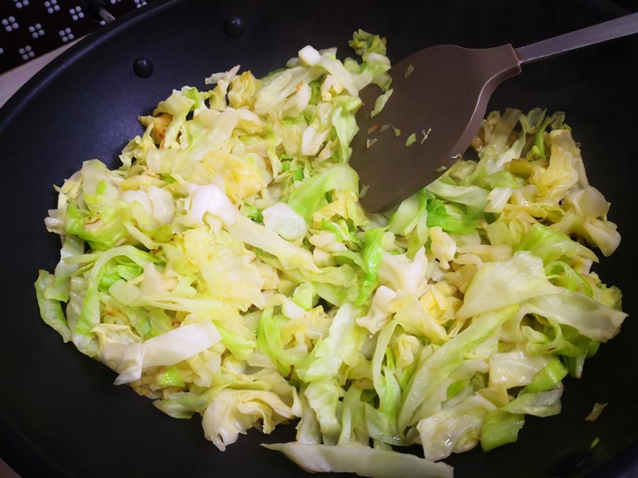 3.然後我們來進行關鍵的一步:起鍋無需加油,下入包菜進行翻炒,這一步是爲了炒出包菜中的水氣,這樣炒好後的包菜會又香又脆又嫩,只是炒的時候要注意火候,同時要不停地用鏟子翻炒,以免將包菜炒糊。大約翻炒3分鐘左右,將包菜盛出裝盤備用。
