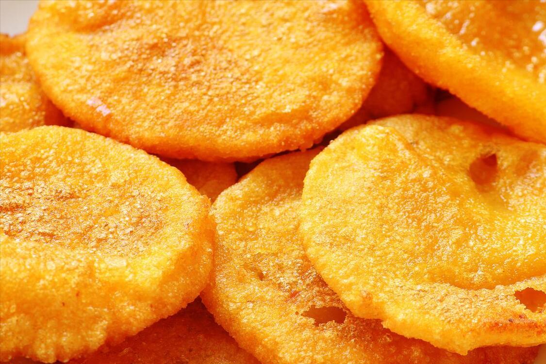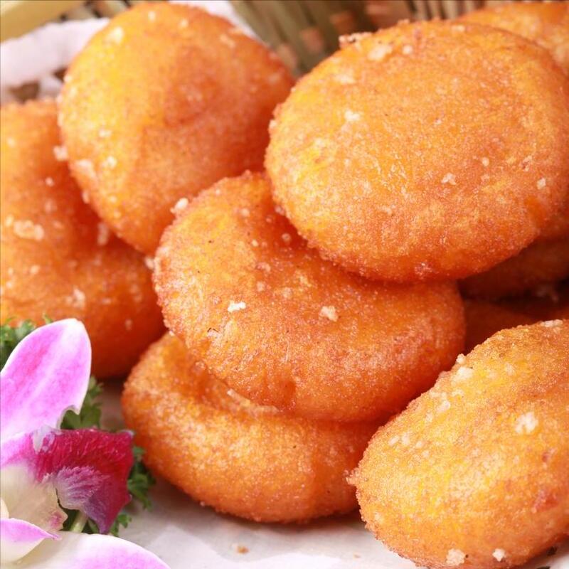 2、然後把糯米粉和白糖倒進去,充分攪拌,直至和成一個柔軟的麪糰。分成一個個的劑子,每一個都揉圓按扁。接下來平底鍋中倒入一層薄薄的油,下入南瓜餅開始煎,煎到金黃鼓起來以後,出鍋開喫。