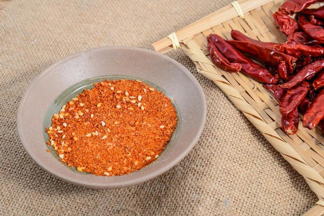 2、隨後再準備一個碗,往碗里加上適量的粗辣椒麪和細辣椒麪,兩者的比例1:1就可以,要想味道更香的話,隨後還要加上1勺白芝麻,倒進去以後還需要進行調味,再往碗里加入適量的鹽、雞精調味,將其充分攪拌均勻就可以了。