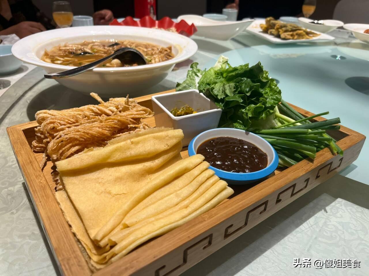 煎餅卷饊子也是我們魯菜的特色菜,尤其是煎餅特別的有嚼勁,很廢腮幫子哦,不過我們都愛喫,捲上大醬、香菜、生菜葉,再放上饊子一卷,喫一口嘎嘣脆,好喫極了。