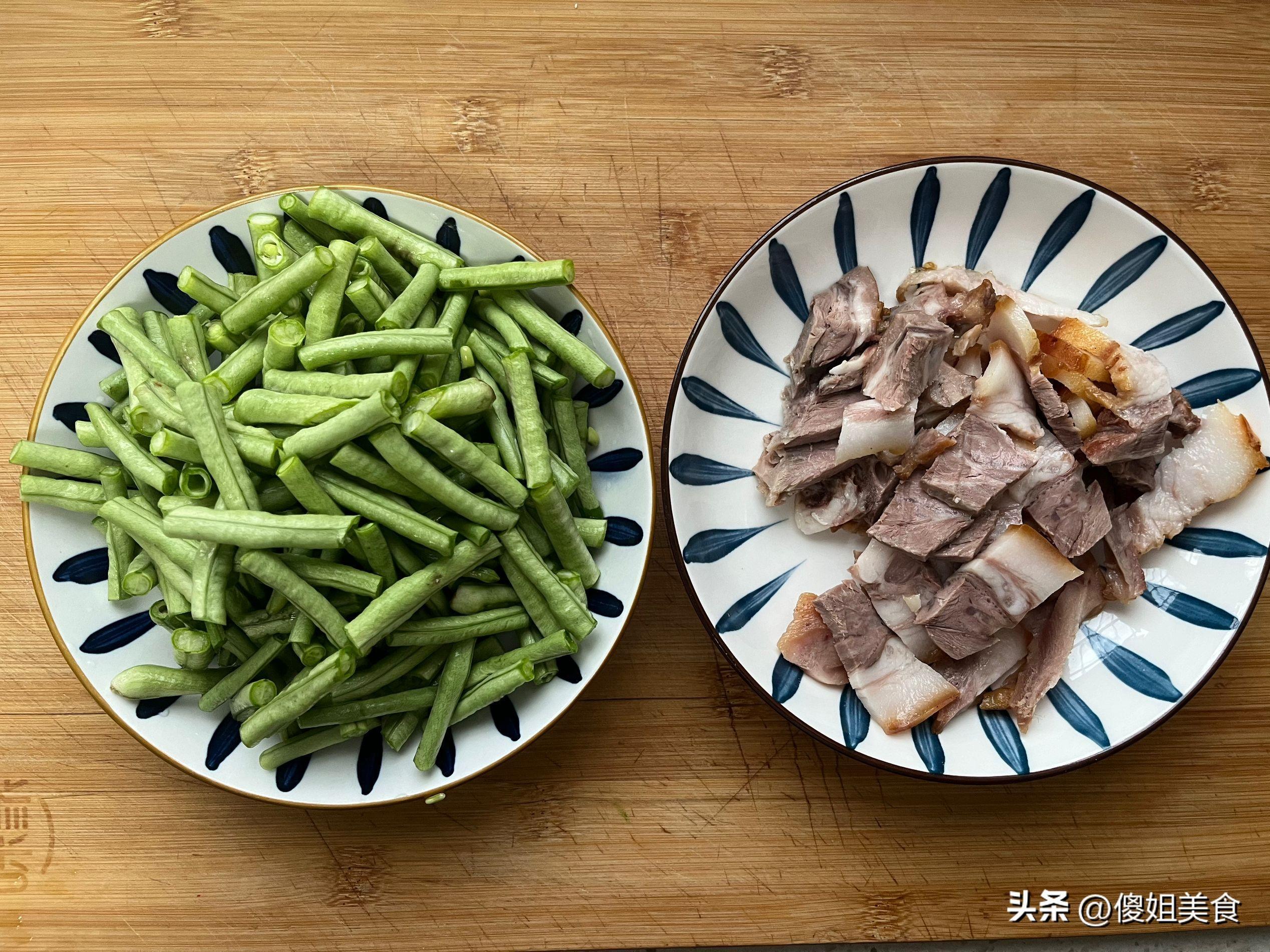 早上送完孩子去肉食店買了一小塊的豬頭肉,孩子們喜歡喫瘦一點的,買了塊肥瘦相間的,把豬頭肉切成薄片。長豆角準備一小把,把頭尾擇掉一丁點,然後切成段,再用鹽水浸泡清洗乾淨,最後瀝乾水分放入盤內。
