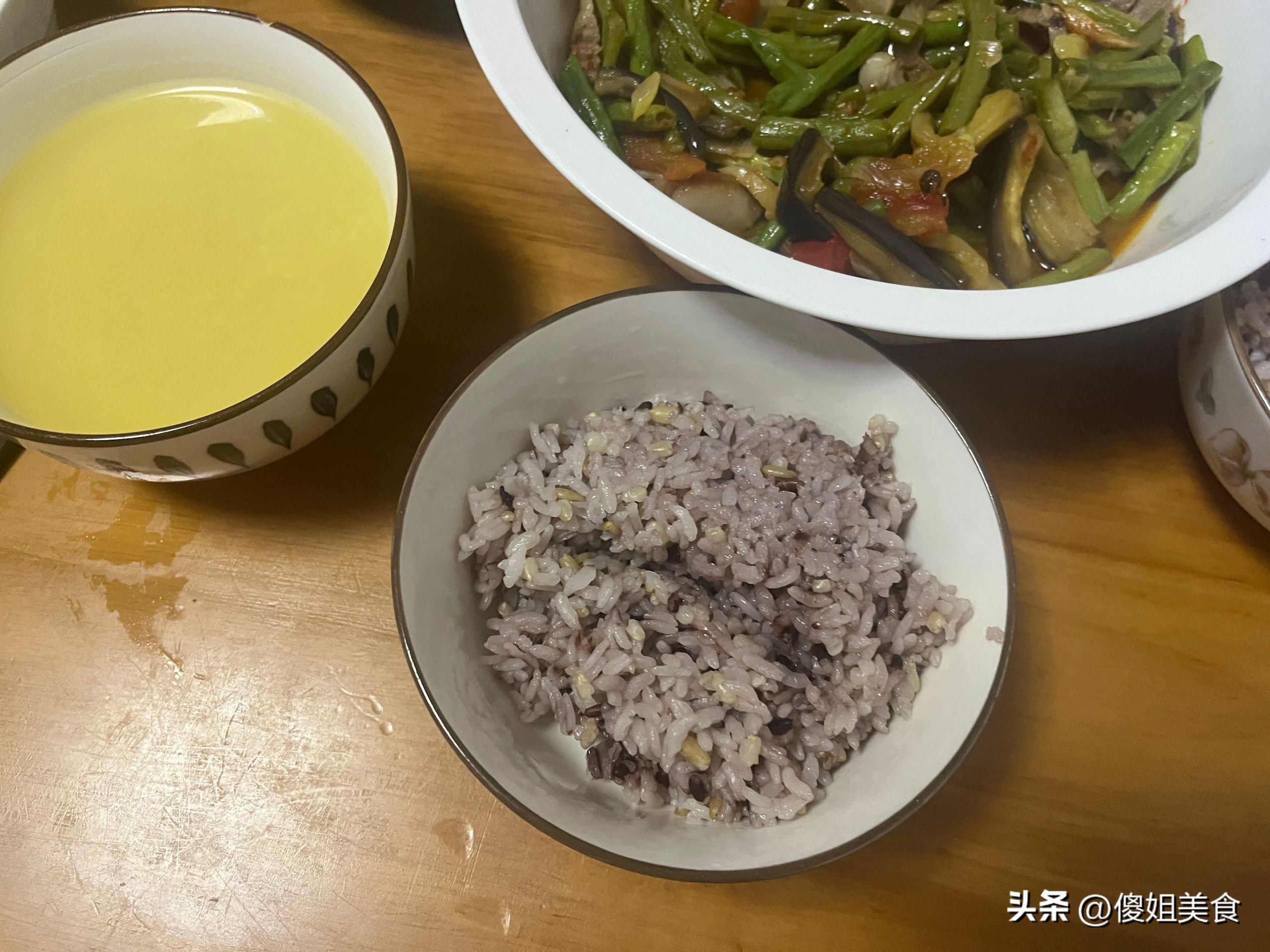 中午蒸了他們爺三個最愛喫的米飯,每次我家蒸米飯都是蒸糙米加白米米飯,提前把大米淘洗乾淨,放入蒸鍋內,將米飯浸泡30分鐘後再通電開始蒸,這樣蒸熟的米飯軟軟的口感賊好喫。