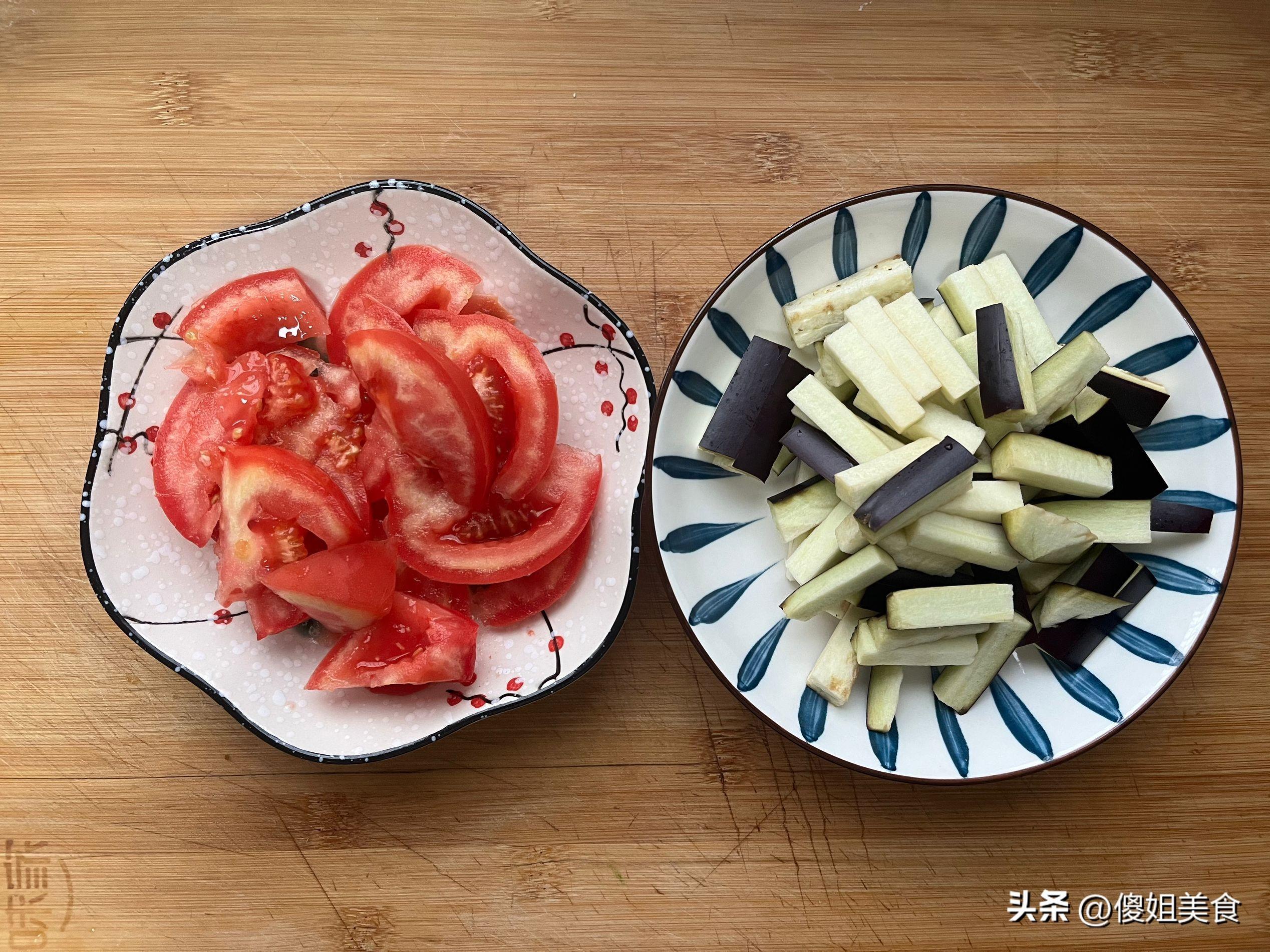 這個季節我種的小菜園裏可熱鬧了,心情不好的時候來小菜園看一下,五顏六色,心情舒暢多了。在菜園裏摘了一個新鮮的西紅柿和茄子,分別洗乾淨後改刀切成塊狀,茄子容易氧化變黑,記得要用清水浸泡一下,把茄子和西紅柿塊都放入盤子內備用就可以。