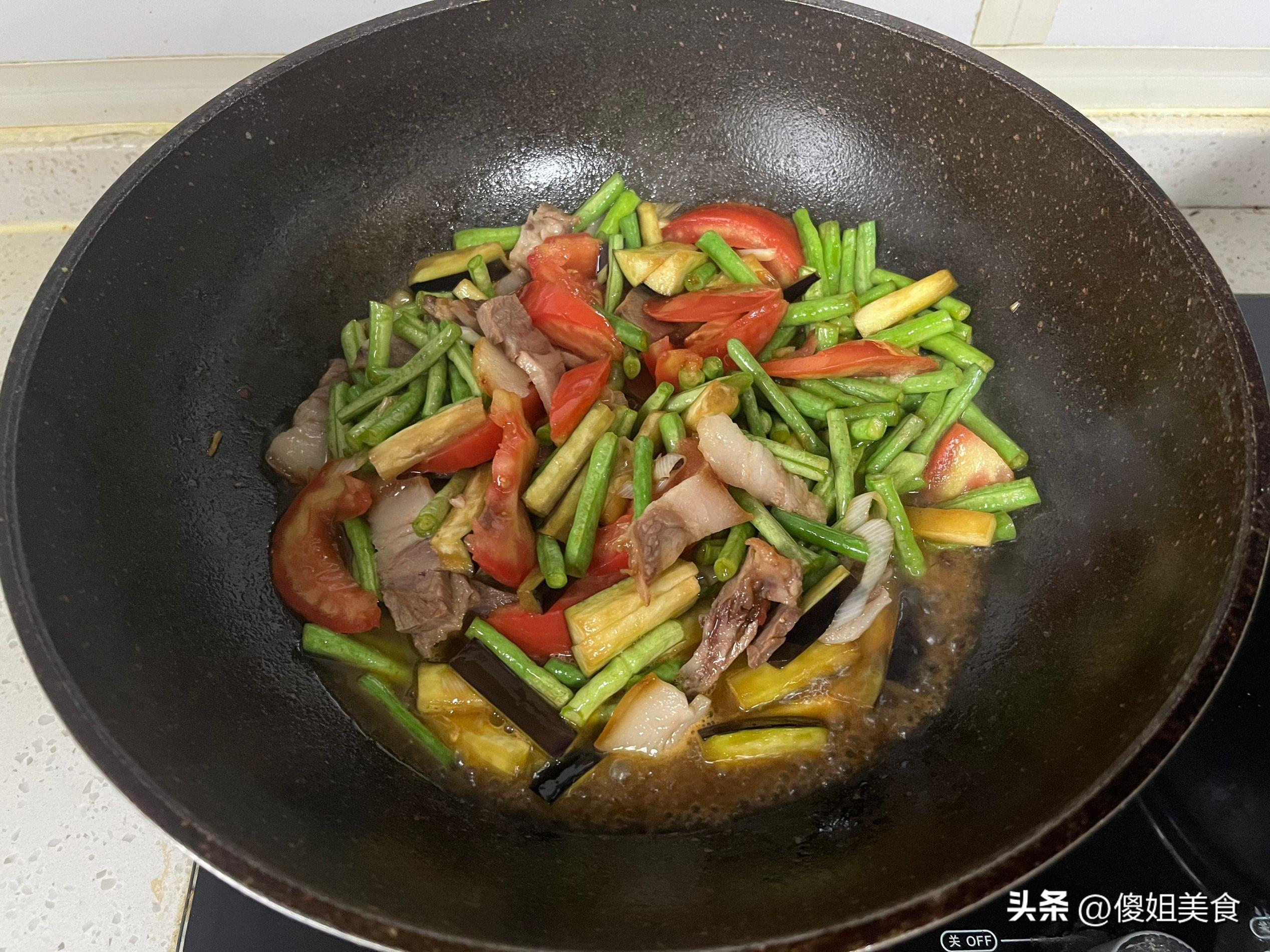 鍋中倒入適量的食用油,放幾粒花椒、蔥姜炒出蔥香味,隨後把西紅柿、豆角、茄子、豬頭肉都一起放入炒鍋內,翻炒幾下後淋入2勺味達美、少許醬油、雞精、1勺耗油和少許鹽,翻炒至上色,再沿鍋邊淋入適量的清水,蓋上鍋蓋大火燉15-20分鐘就可以。