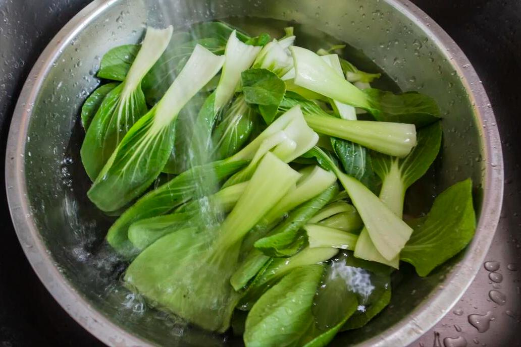 2、隨後還需要準備一盆清水,然後往裏面來點鹽,攪拌均勻之後將小青菜倒進去浸泡15分鐘。畢竟現在的蔬菜,哪一個不打農藥?喫起來不放心的話,一定要提前用鹽水浸泡一下,這樣喫起來無負擔。