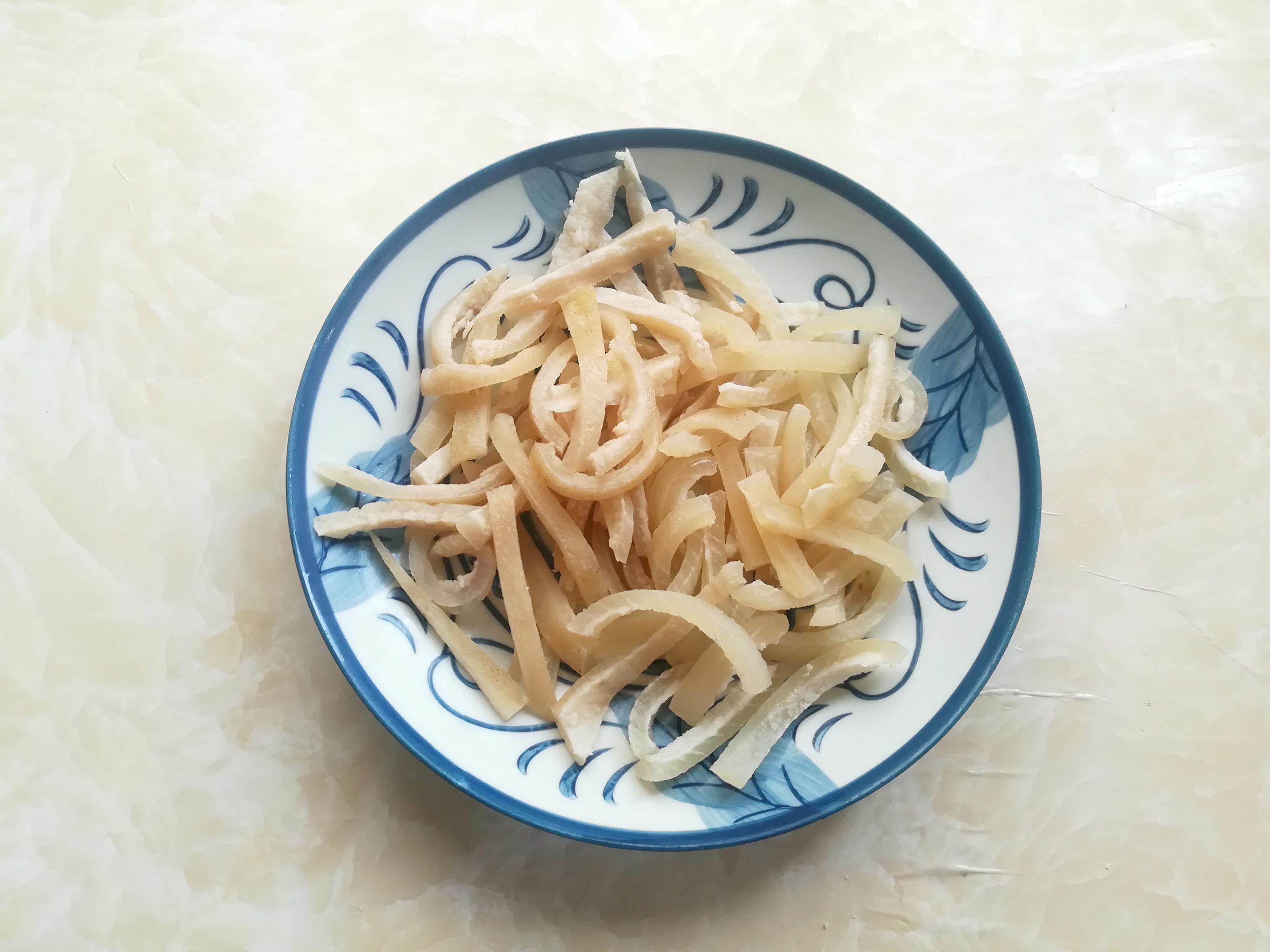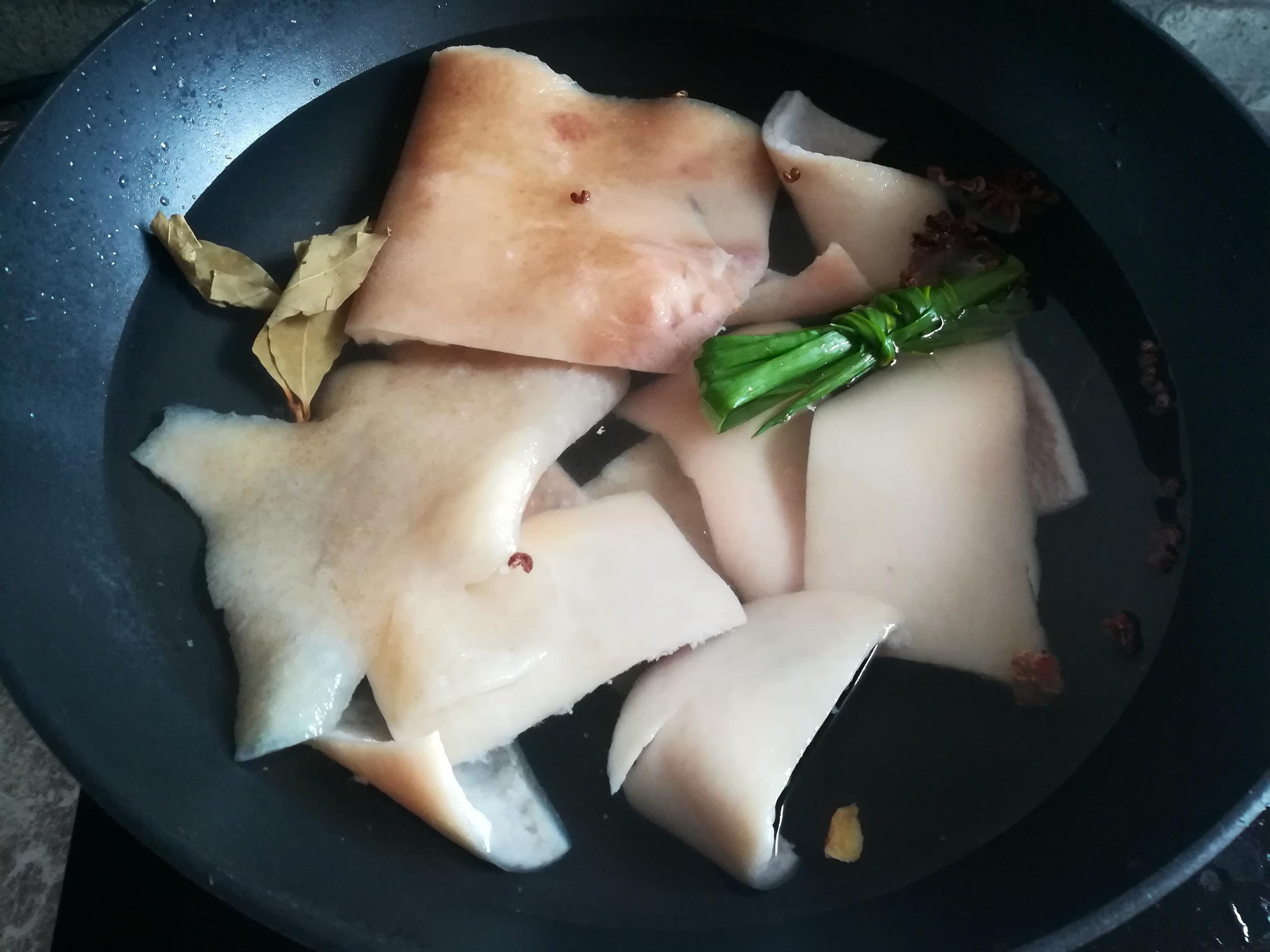 做法:1,豬皮清理乾淨扎手的碎毛,剔掉油脂,冷水進鍋,放入八角、花椒、香葉和香蔥,中火加熱煮到豬皮變硬,撈出來過涼水,清洗乾淨,切成合適的方塊。