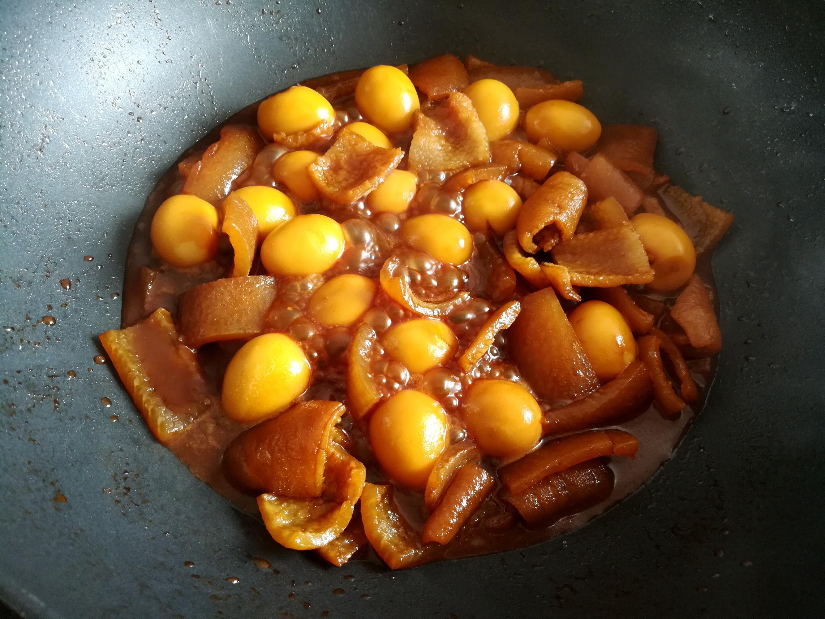 5,加適量的水,大火煮開,加入鵪鶉蛋一起煮到豬皮變得軟糯,大火收汁即可。