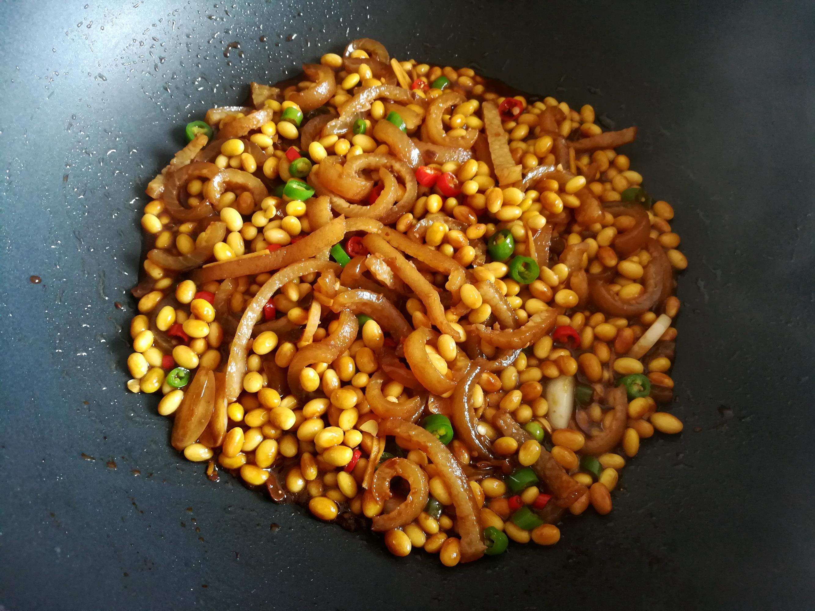 4,加入紅燒醬油翻炒上色,加入煮熟的黃豆,加半碗煮過黃豆的水燜幾分鐘,加適量的鹽調味。