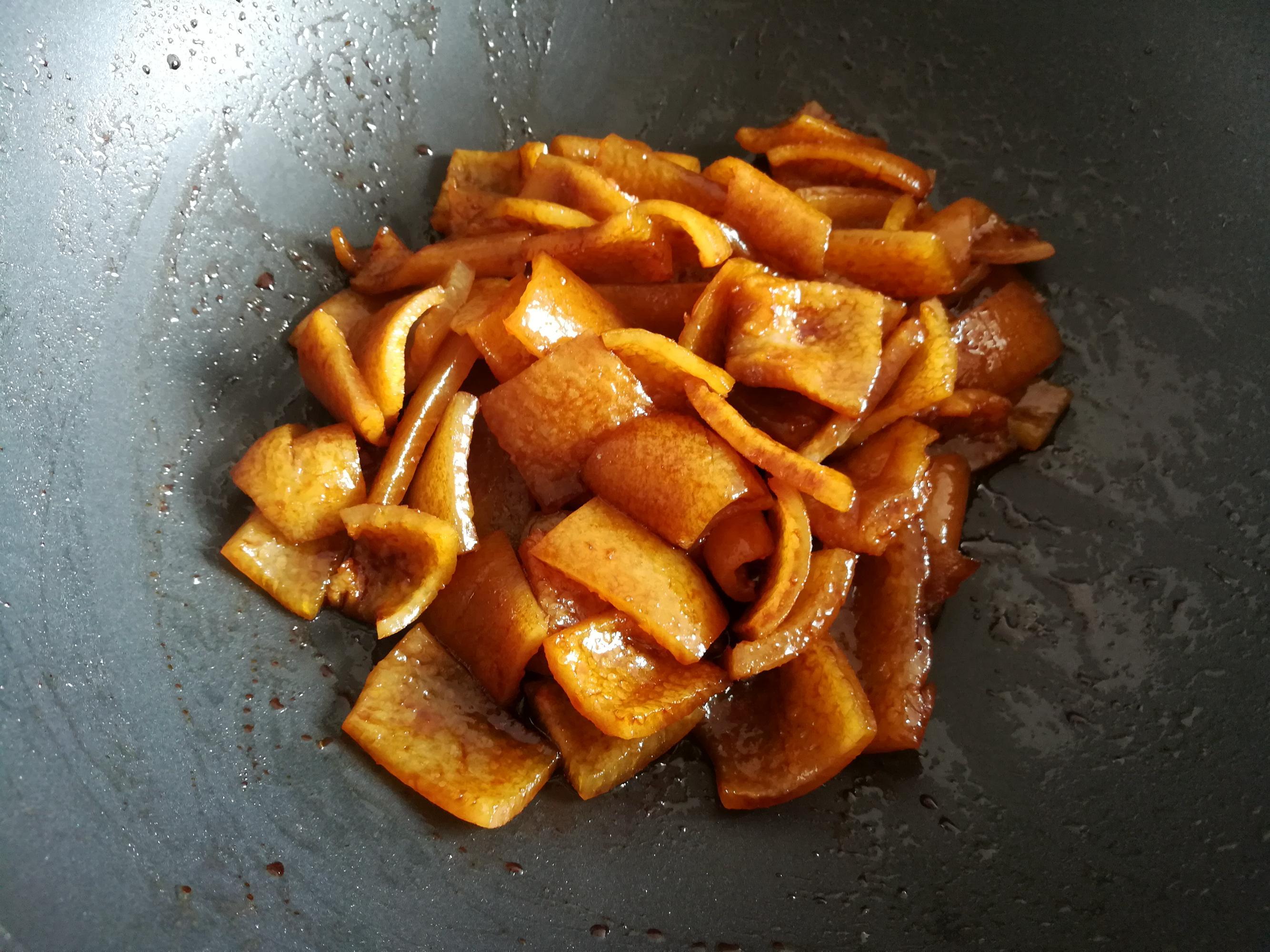 4,加入豬皮翻炒一下,加入紅燒醬油翻炒上色。
