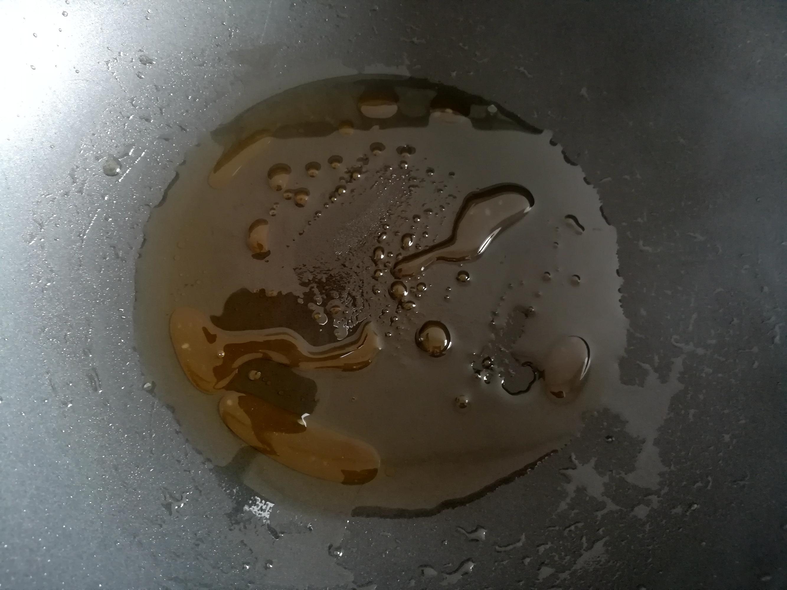 3,熱鍋放油,放入碎冰糖,中小火加熱到糖融化,炒出糖色。
