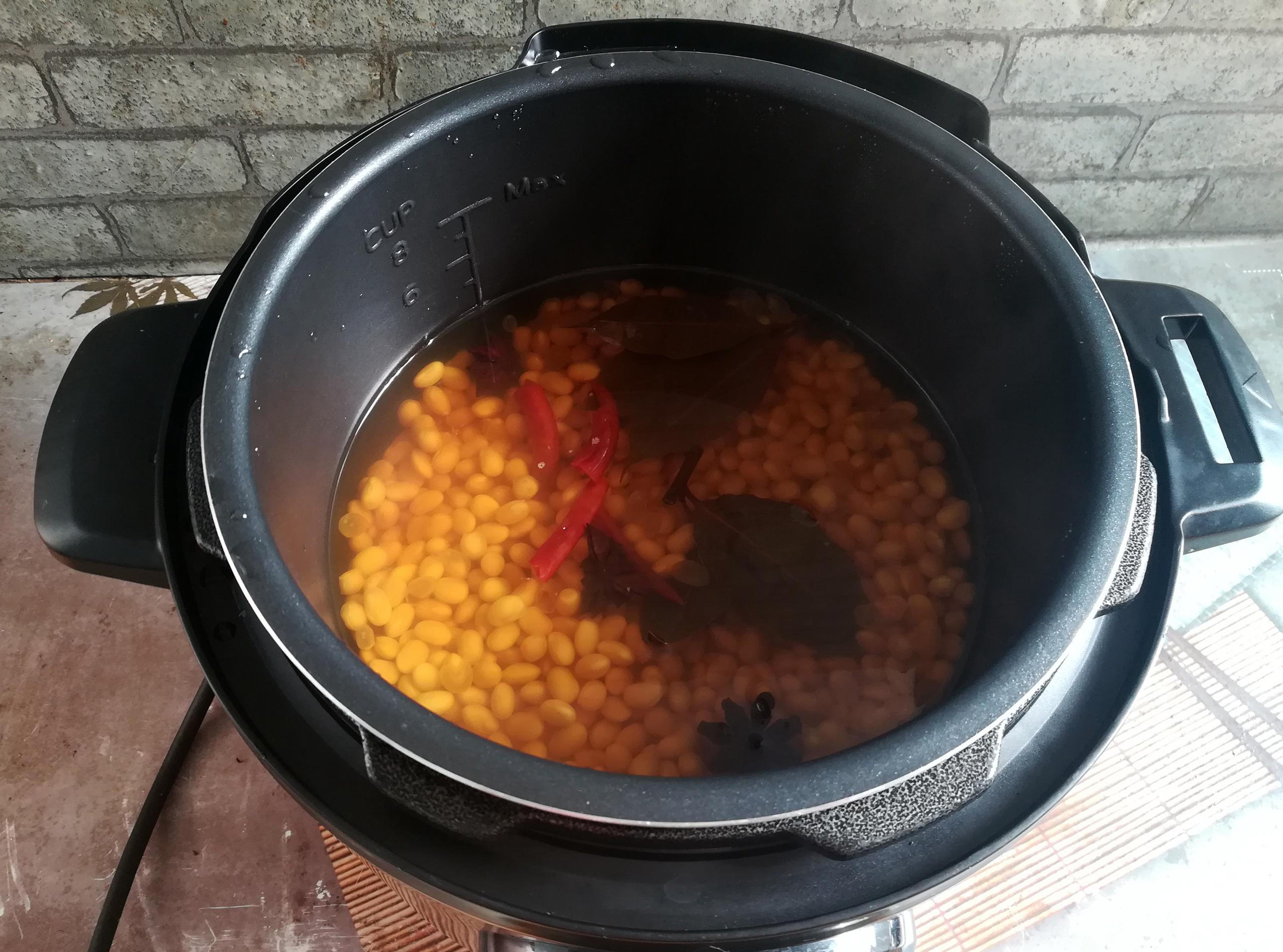 做法:1,黃豆清洗乾淨,不需要泡發。放入電壓力鍋中,加入八角、香葉、幹辣椒,燉20分鐘,撈出來瀝乾水分。
