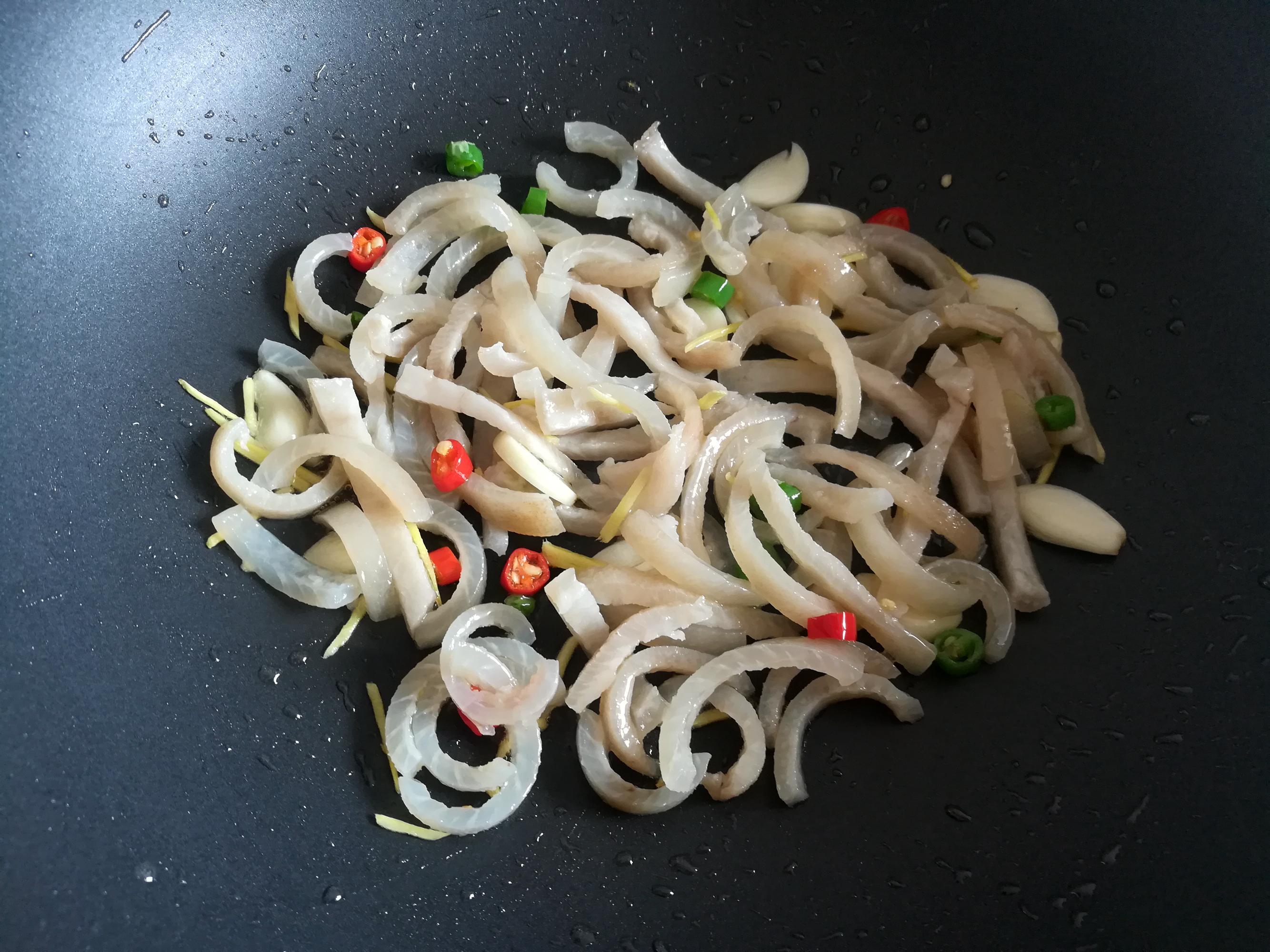 3,熱鍋放油,放入姜蒜和辣椒熗鍋,加入豬皮翻炒均勻。