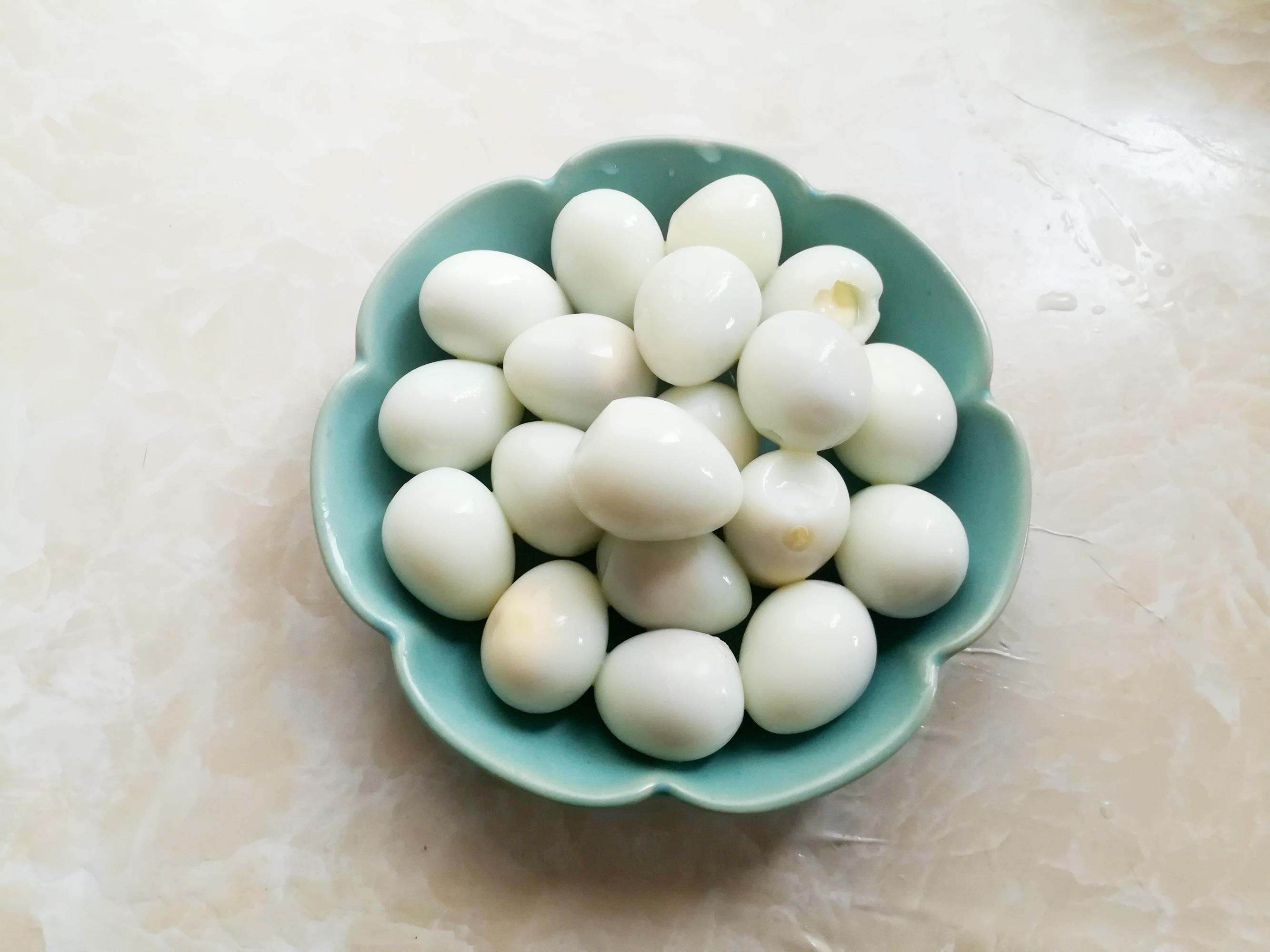 2,鵪鶉蛋冷水進鍋,大火煮8分鐘,撈出來剝殼,清洗乾淨,瀝乾水分。