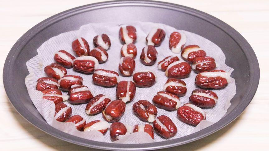 2、將搓好的糯米糰放入紅棗中,夾緊。蒸鍋中加入適量水,燒開後放入紅棗糯米糕,蒸約 15 分鐘即可。