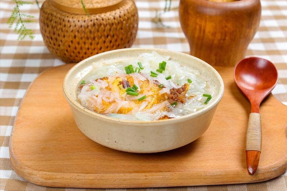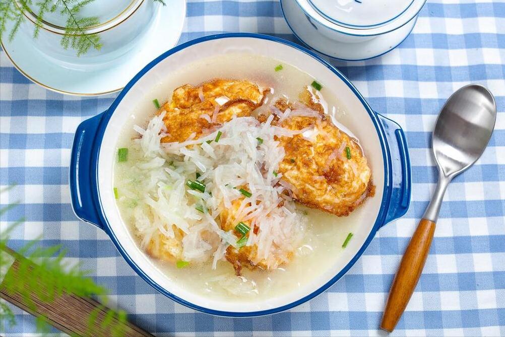 白蘿蔔洗淨切絲,枸杞洗淨,蔥花切好,鍋子內倒油燒熱後,下入雞蛋開始煎,煎到金黃後接着再把白蘿蔔倒進去,稍微炒一會兒,炒到變軟後往裏面添上清水,大火燒開後繼續煮,煮到湯汁濃白後,加入食鹽、味精調味,加上枸杞、蔥花,出鍋開喝。