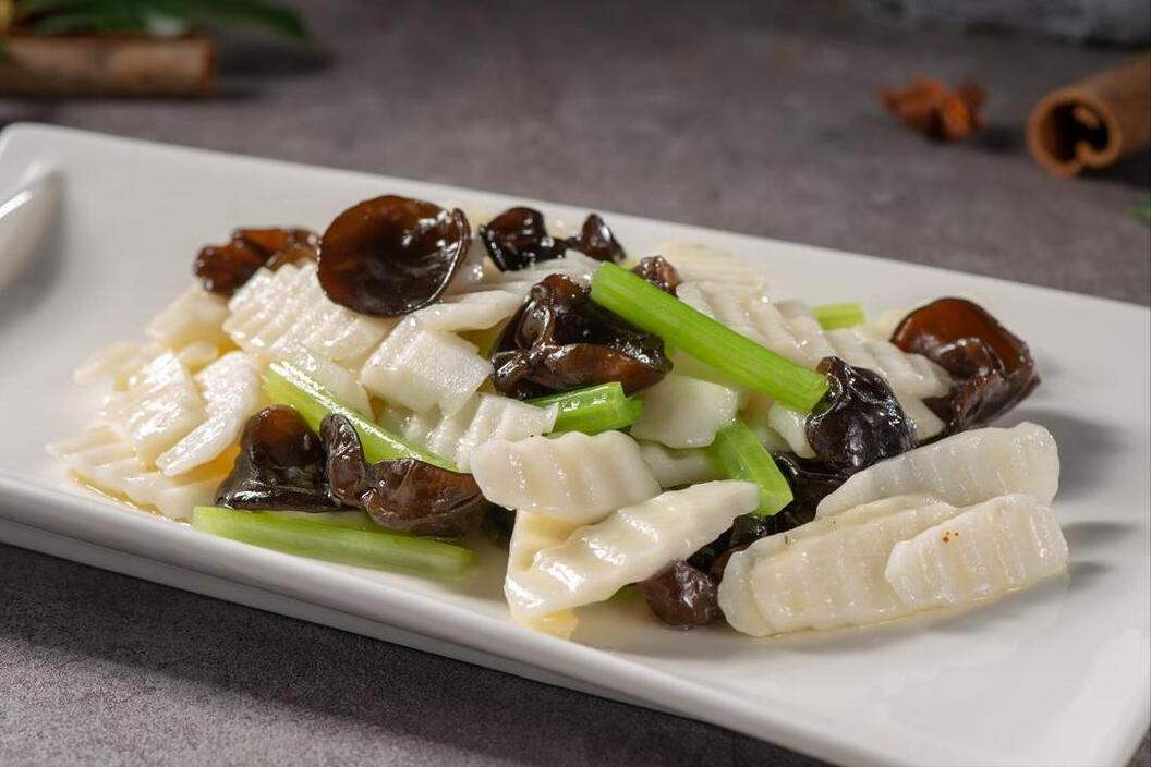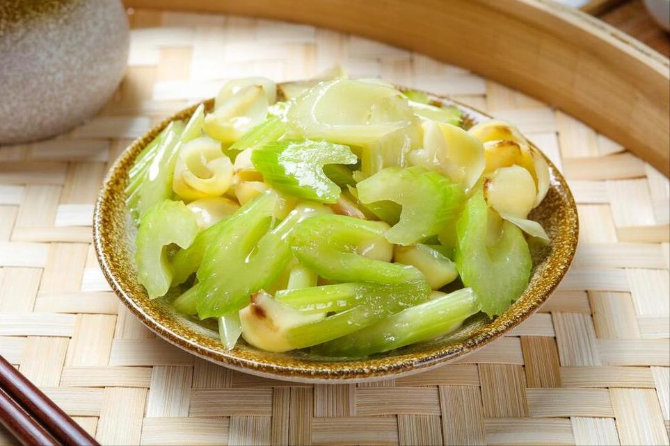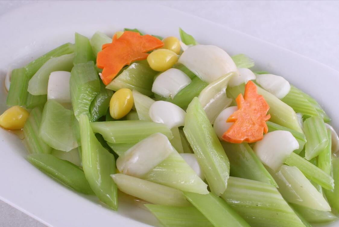 2、隨後需要將西芹焯水,準備一鍋水燒開,然後下入西芹開始焯水,變軟後盛出來備用。隨後往鍋內倒油,燒熱下入百合、胡蘿蔔、木耳翻炒,炒製片刻直至斷生,再把西芹加進去,順便用鹽和味精調味,緊接着準備小半碗水澱粉,將其澆在鍋中,待湯汁濃郁後出鍋。