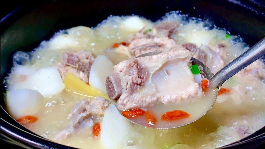 2、焯好水的排骨撈出,放入砂鍋中,加入適量清水,大火煮開後轉小火燉煮約 40 分鐘。放入山藥,繼續燉煮約 30 分鐘至山藥熟爛,加鹽調味即可。
