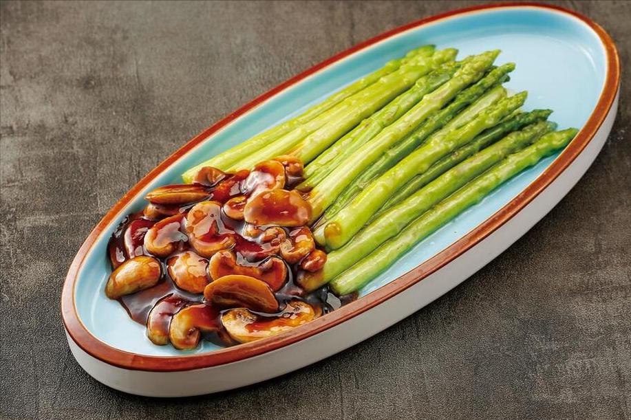 用到:蘆筍、口蘑、大蒜、鹽、味精、蠔油、食用油